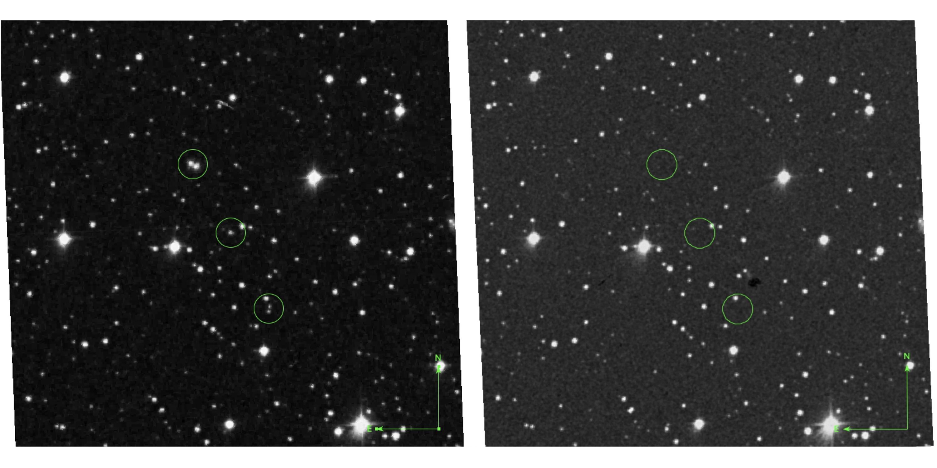 Transient flashes – momentary light bursts, circled in green – seen in a digitized astronomical plate from the Palomar Sky Survey on July 27, 1952. Note that the transients disappear in the 2nd image. Image via Villarroel et al./ Publications of the Astronomical Society of the Pacific.