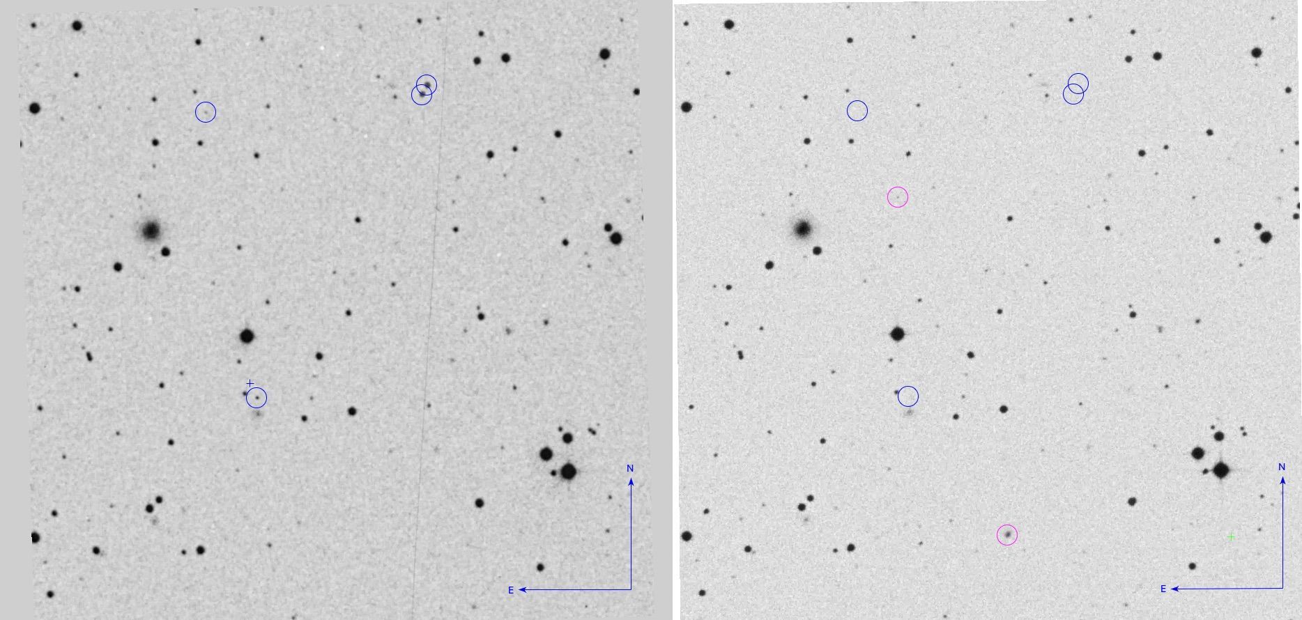 The candidate in SuperCosmos scans of POSS-I red (left) and POSS-II red (right) images (inverted). Transients are marked with blue circles. The candidate with a measured coordinate is marked with a cross (+). Pink circles show defects. Also the grey line crossing the POSS-I field is a scanning defect. Four transients are visible in the POSS-I image, where three follow a straight line.